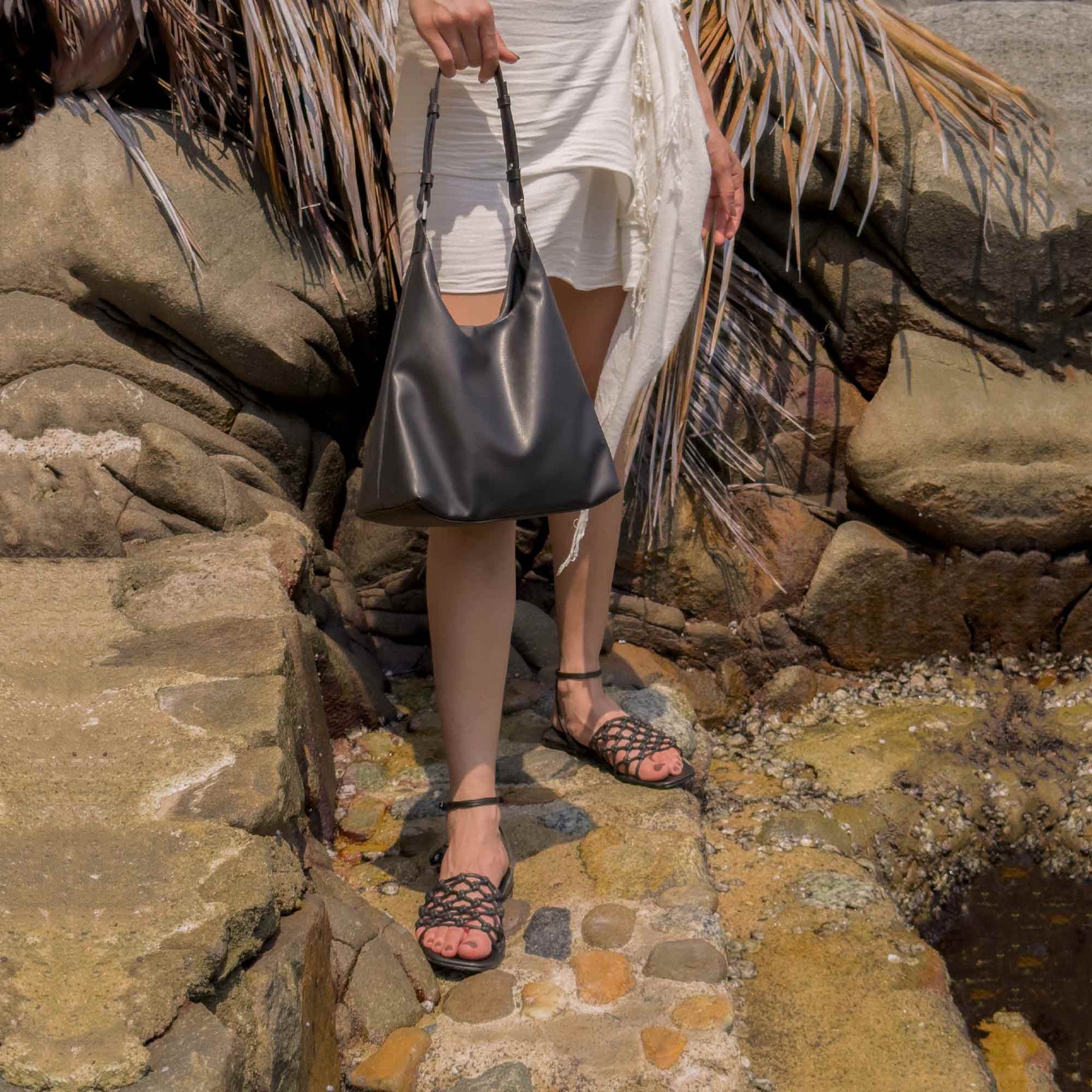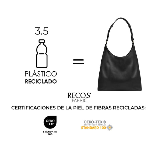 Hecha artesanalmente en nuestro taller en Puerto Vallarta, está confeccionada con materiales sostenibles: piel vegana de fibras recicladas equivalente a 3.5 botellas de plástico reciclado de 600 ml, lo que refleja nuestro compromiso con la moda responsable.