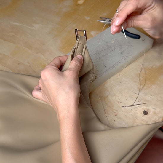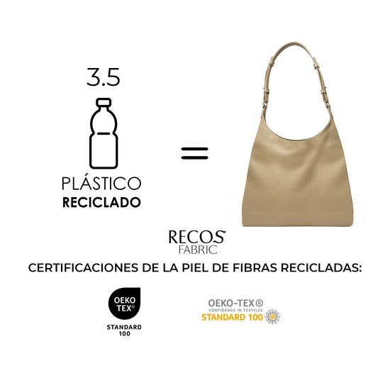 Hecha artesanalmente en nuestro taller en Puerto Vallarta, está confeccionada con materiales sostenibles: piel vegana de fibras recicladas equivalente a 3.5 botellas de plástico reciclado de 600 ml, lo que refleja nuestro compromiso con la moda responsable.