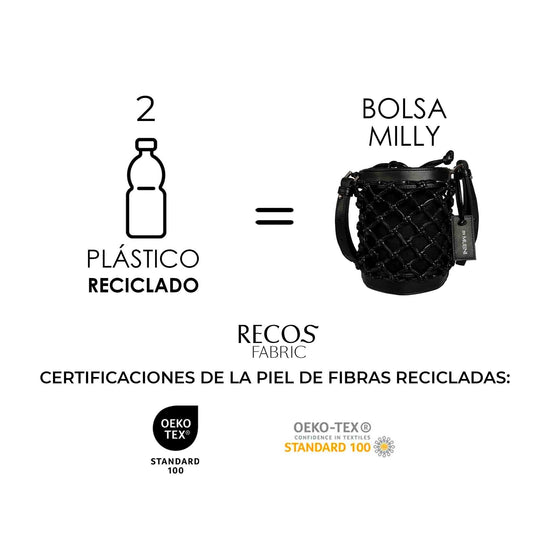 La bolsa MILLY está tejida en macramé con una innovadora piel vegana ecológica hecha en México, compuesta de maíz y trigo, además de incorporar dos botellas recicladas de plástico de 600 ml y algodón reciclado de origen post-industrial. Cada material ha sido cuidadosamente seleccionado para asegurar su impacto positivo en el medio ambiente.
