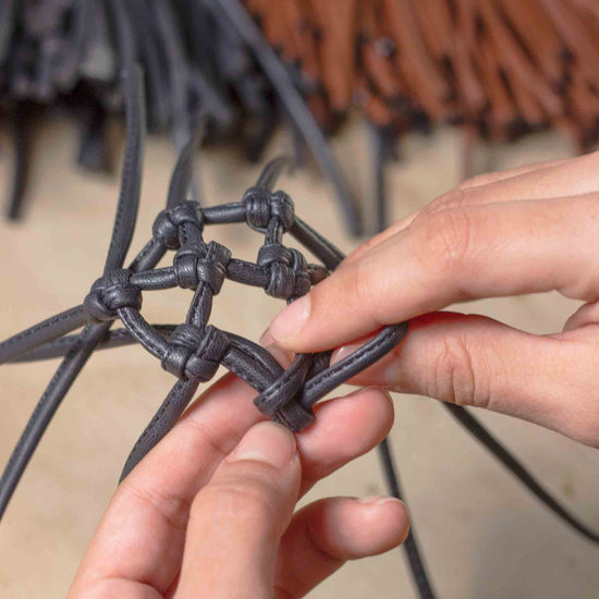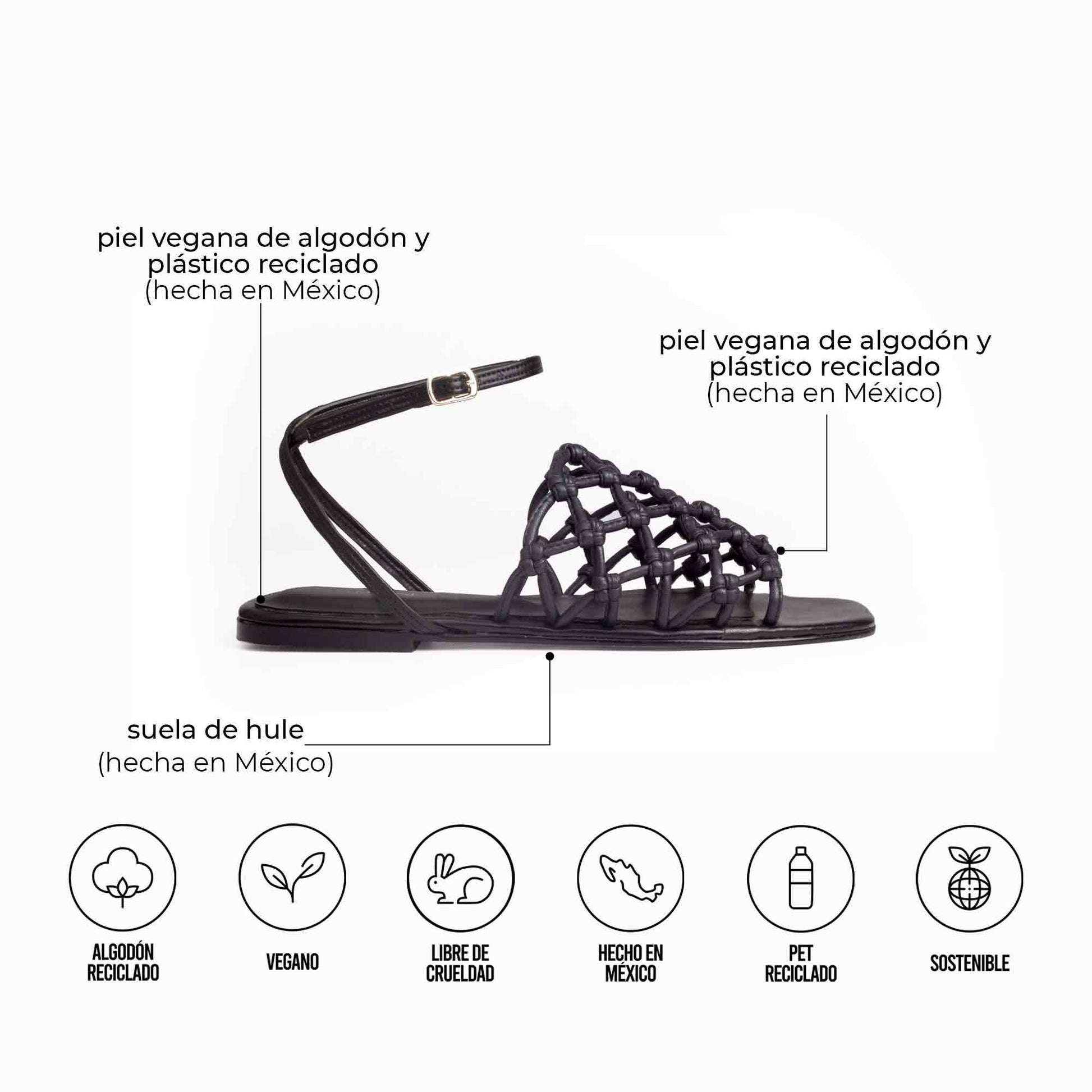 Estas sandalias están confeccionadas con tejido artesanal de macramé y piel vegana hecha de fibras recicladas. Cada par contribuye al reciclaje de 1.2 botellas de plástico de 600 ml. Su correa ajustable ofrece un soporte seguro, mientras que la plantilla acolchada y la suela de hule aseguran comodidad y durabilidad. Están disponibles en dos colores atemporales: black y caramelo.
